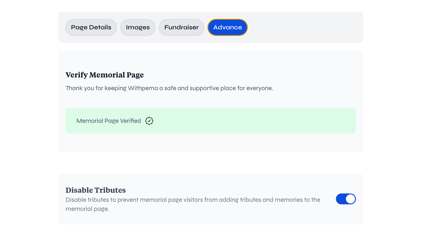 ⚙️ Memorial page admins can re-enable tributes anytime from the edit memorial page advanced tab.