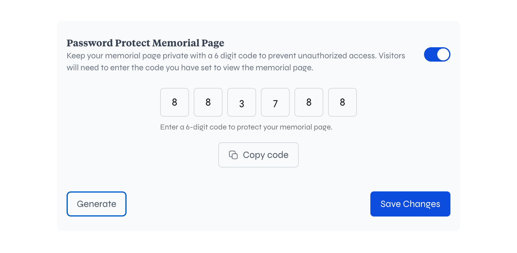Memorial admins can enable a “Password Protect” option and set a unique 6-digit PIN.